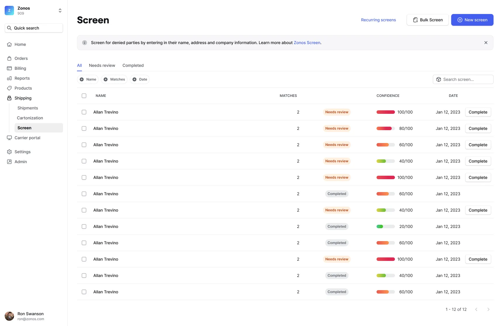 - Click Screen parties. Once the submitted CSV is processed, the results will appear on the Screen page. You can view those results in detail by clicking anywhere on the row for each screening.